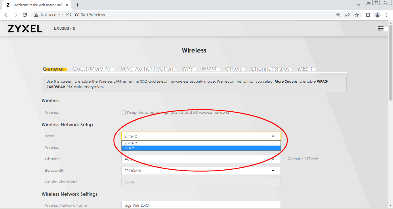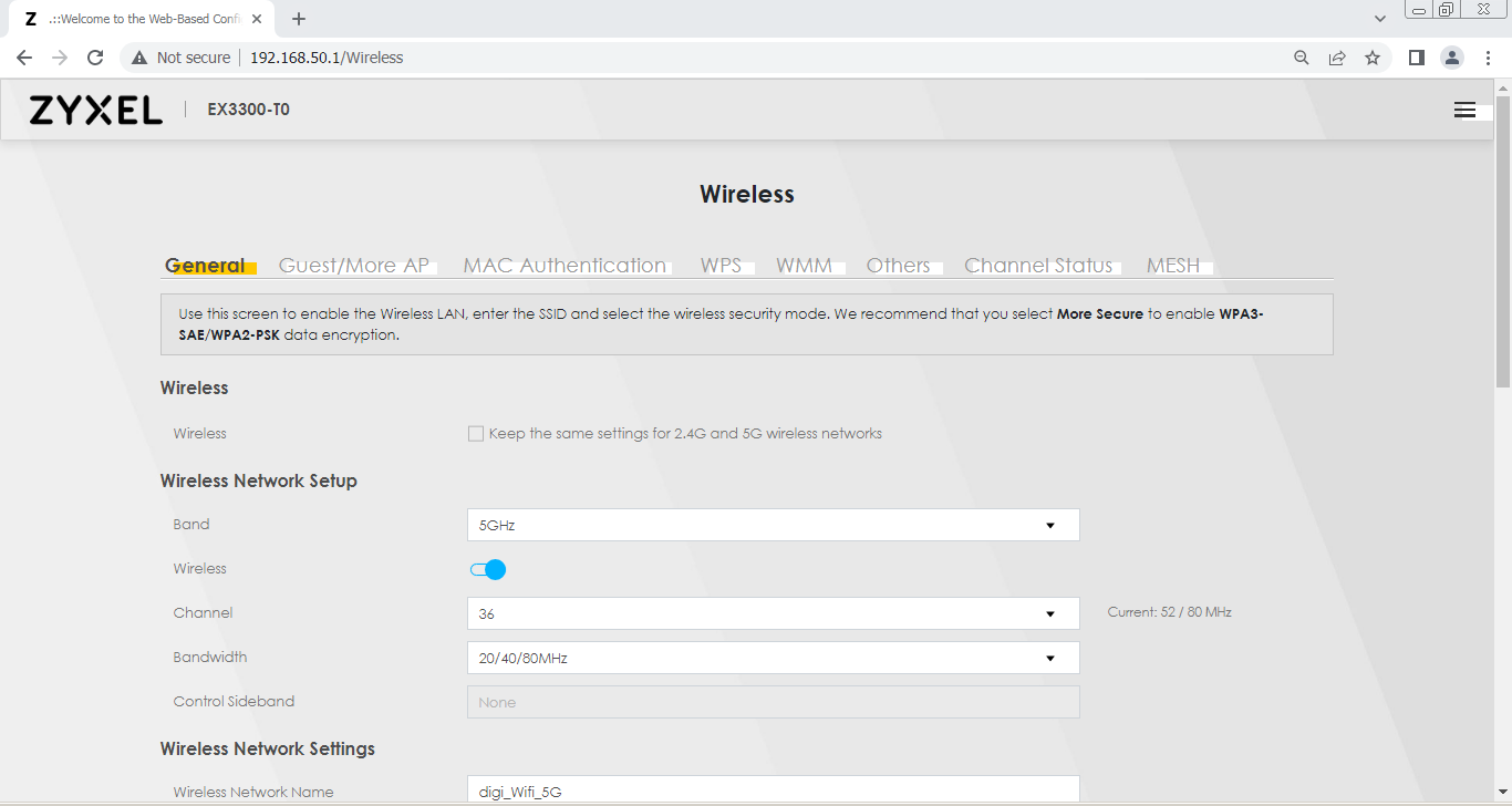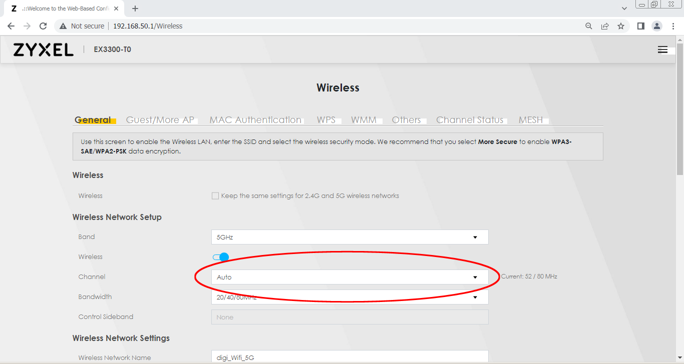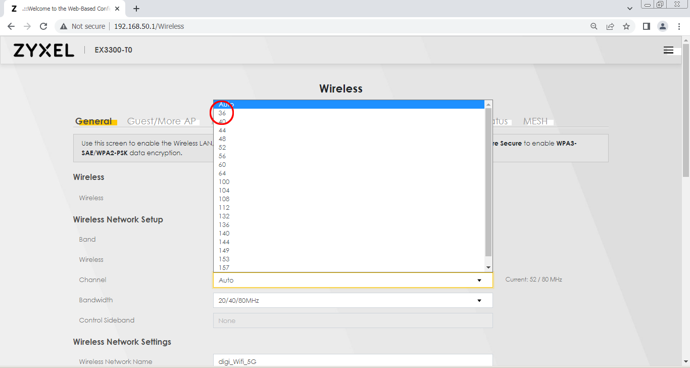 Change 5G Wifi ChannelDigi ZYXEL EX3300-T01. Login into Web-Based Configurator (192.168.50.1) Login into Web-Based Configurator, locate the Setting Icon at top right corner of the screen. 2. Enter Network Setting > Wireless 3. Disable MPro Mesh Enter Network Setting > Wireless > MESH. Disable MPro Mesh. 4. Uncheck Keep the same settings for 2.4G and 5G wireless networks Enter Network Setting > Wireless > General. Uncheck “Keep the same settings for 2.4G and 5G wireless networks”. After uncheck click [Apply] 5. Select Band from 2.4GHz to 5GHz Under “Wireless Network Setup”, “Band” choose [5GHz]. 6. Select Channel from AUTO to 36 Under “Wireless Network Setup”, “Channel” choose [36]. Share this