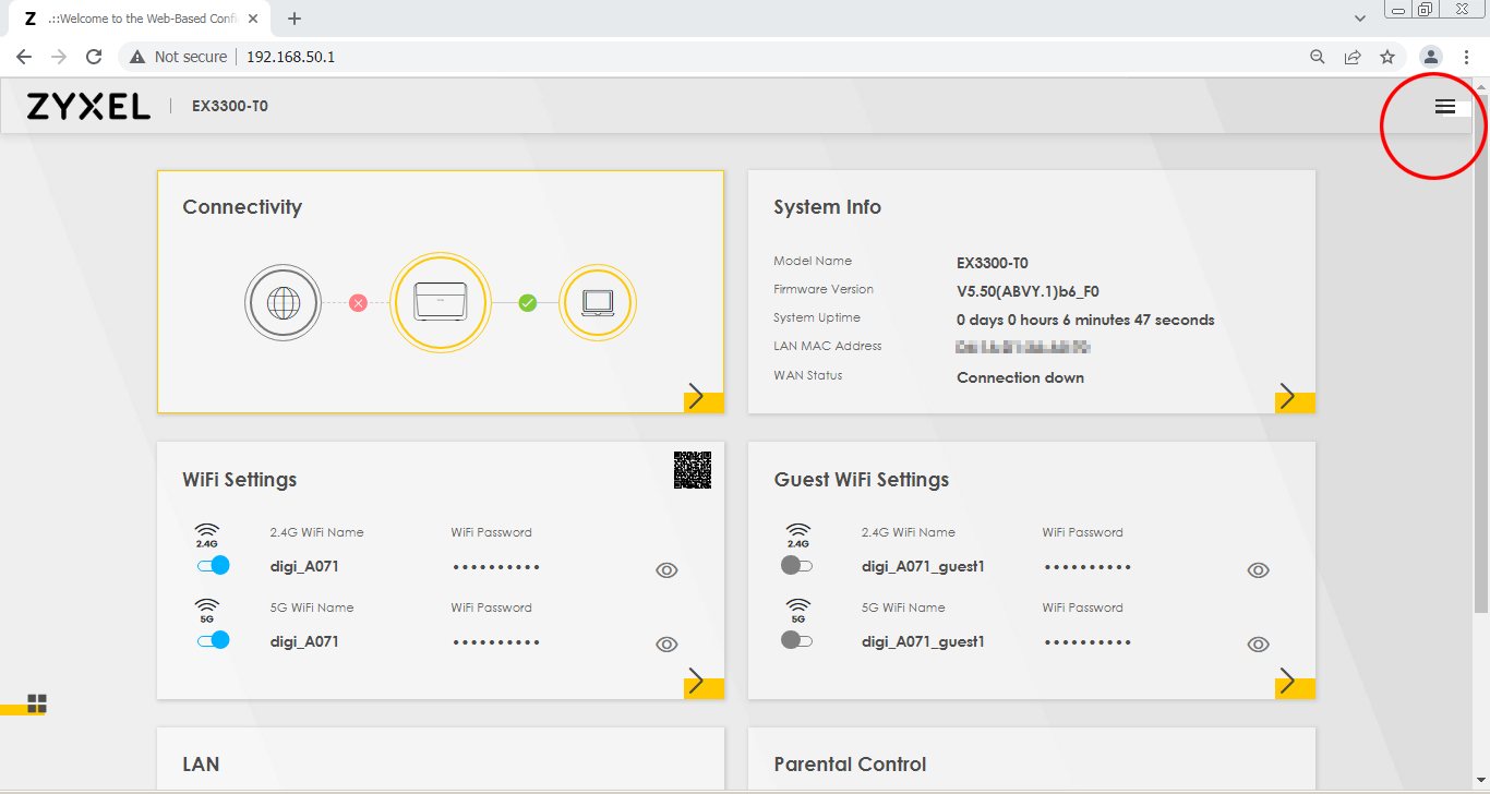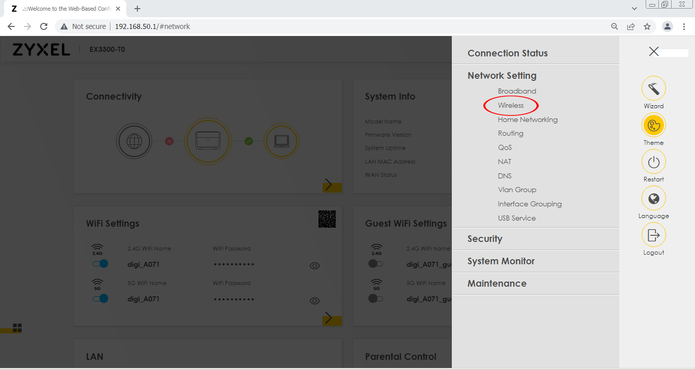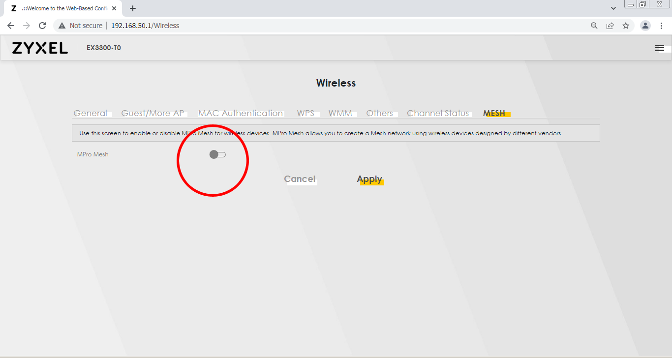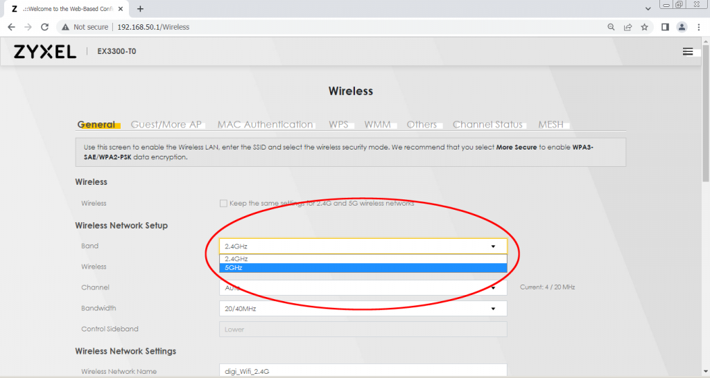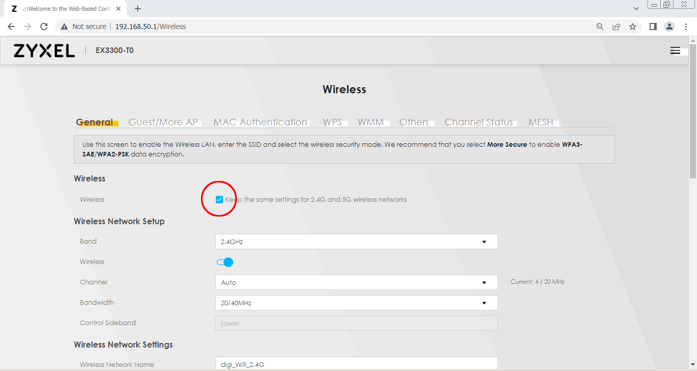 Change 5G Wifi ChannelDigi ZYXEL EX3300-T01. Login into Web-Based Configurator (192.168.50.1) Login into Web-Based Configurator, locate the Setting Icon at top right corner of the screen. 2. Enter Network Setting > Wireless 3. Disable MPro Mesh Enter Network Setting > Wireless > MESH. Disable MPro Mesh. 4. Uncheck Keep the same settings for 2.4G and 5G wireless networks Enter Network Setting > Wireless > General. Uncheck “Keep the same settings for 2.4G and 5G wireless networks”. After uncheck click [Apply] 5. Select Band from 2.4GHz to 5GHz Under “Wireless Network Setup”, “Band” choose [5GHz]. 6. Select Channel from AUTO to 36 Under “Wireless Network Setup”, “Channel” choose [36]. Share this