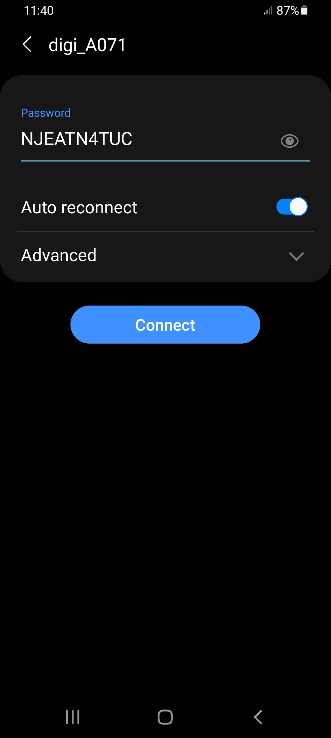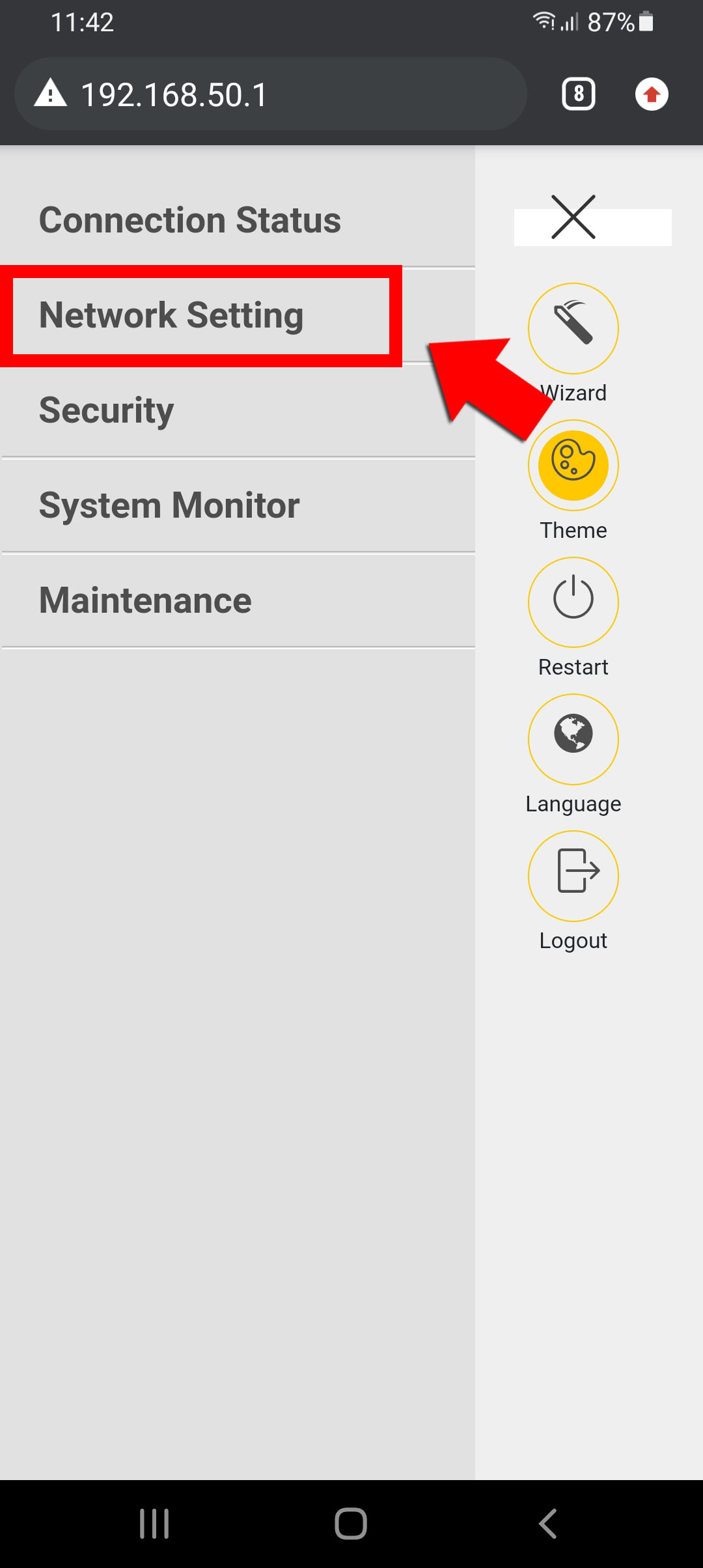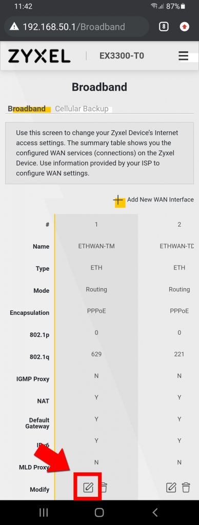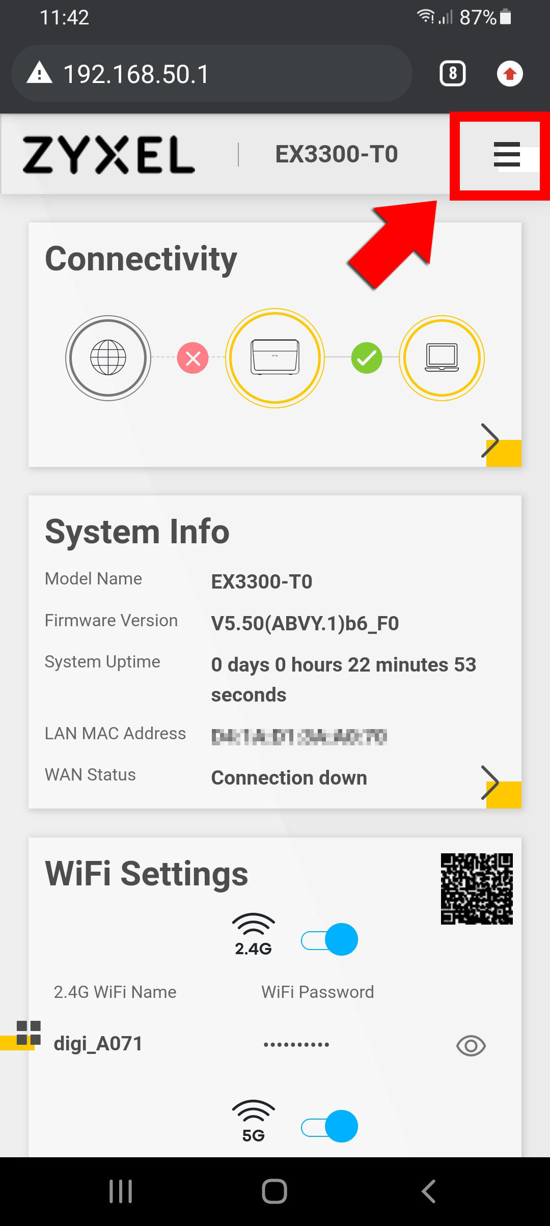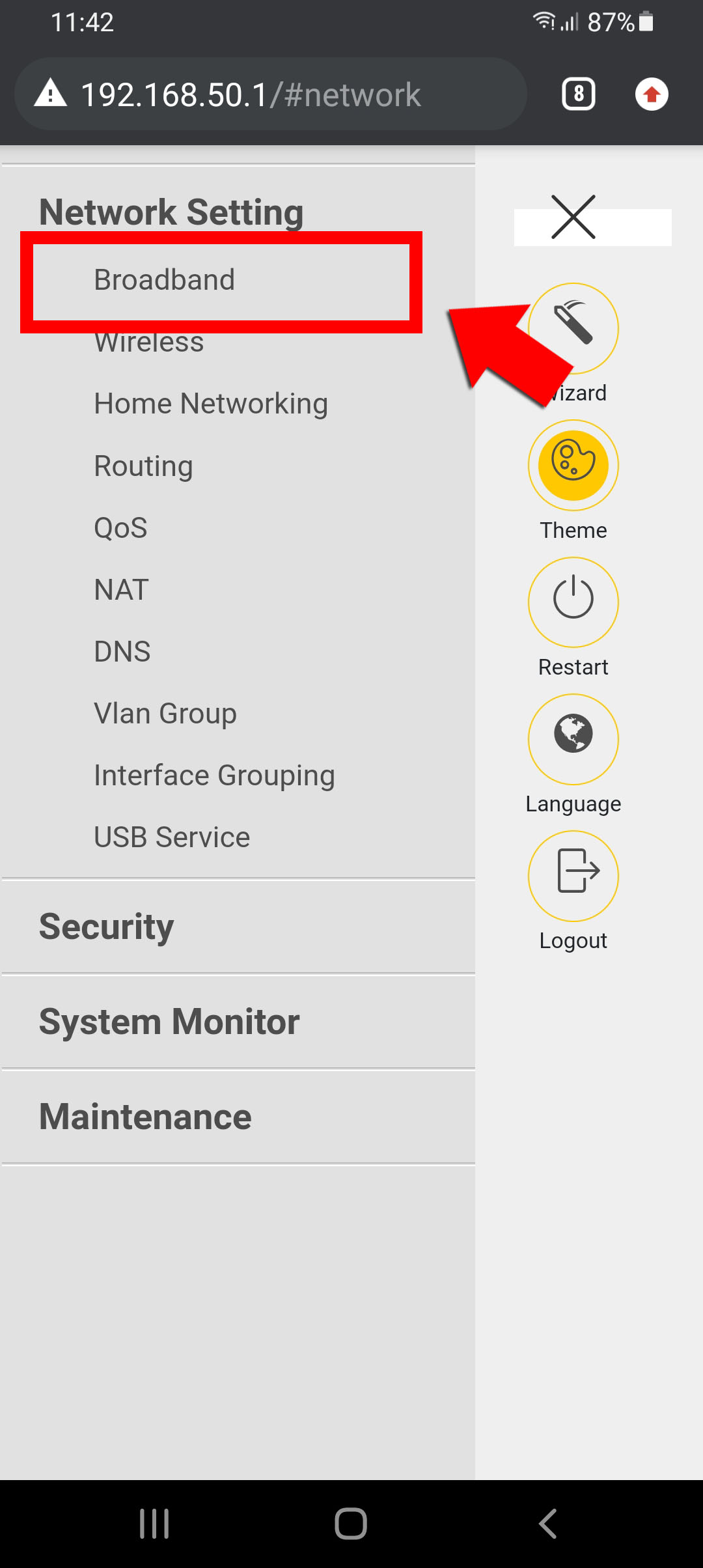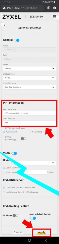PPP Setup (Using Mobile Phone with Wifi)Digi ZYXEL EX3300-T01. Join Digi Wifi using Mobile phone Wifi Information is at the Back of Digi Router (sticker). For this example, Wifi SSID is digi_A071 and the Wifi Password(Wireless Key) is NJEATN4TUC 2. Open Web browser Open web browser app, example: Google Chrome 3. Login into Web-Based Configurator (192.168.50.1) Login into Web-Based Configurator, by URL 192.168.50.1 4. Login into Web-Based Configurator (192.168.50.1) with Username and Password Login into Web-Based Configurator by enter Login Username and Password. Login Username and Password is located at the Back of Digi Router (sticker). For this example, Username is admin and the Password is F3VGEND3 5. Access Main Menu Access the Main Menu by click the icon show as image below. 6. Select Network Setting from Main Menu Access the Network Setting as image below. 7. Select Broadband under Network Setting from Main Menu Enter Broadband setup by click the Broadband under Network Setting from the Main Menu as image below. 8. Select Broadband #1 to Modify Select Broadband #1 to Modify by click the icon show as image below. 9. Enter PPP Information Enter Your Digi PPP Username and Password. and Press Apply. Example PPP Username from Digi, [PPPUsername]@digi.home.tm Share this
